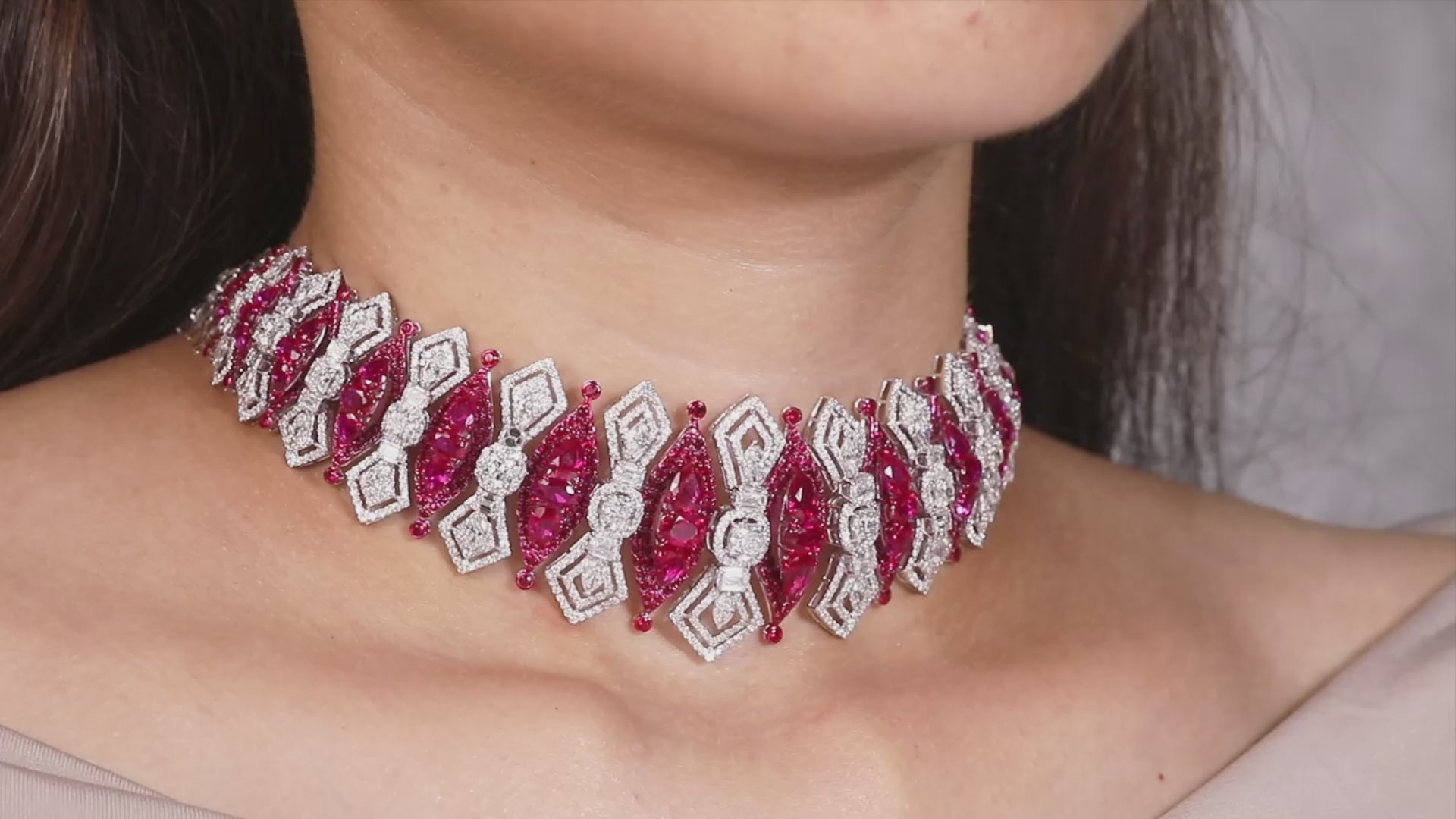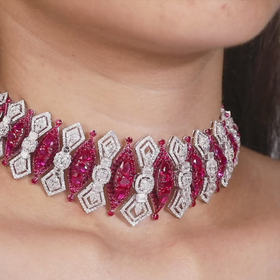 Expertly crafted to perfection, our Art Deco Ruby & Diamond Necklace is a rare piece of high jewelry. Boasting a stunning combination of rubies and diamonds, this necklace exudes luxury and sophistication. Elevate your style and make a statement with this exquisite necklace.