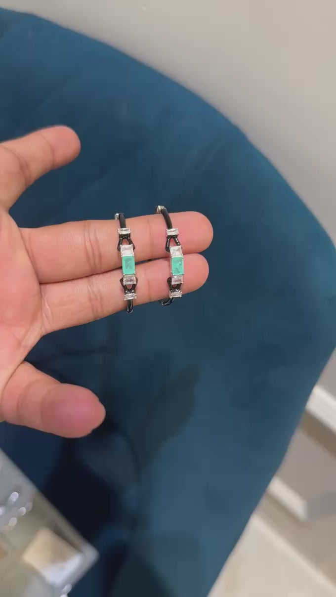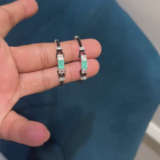 Elevate your style with Blagreen Moso Hoops. These stunning hoops feature black enamel and emerald-like moissanites, surrounded by fine gemstones. Crafted with the utmost precision and quality, these hoops will add a touch of elegance to any outfit. Upgrade your look with these stylish and classic earrings.