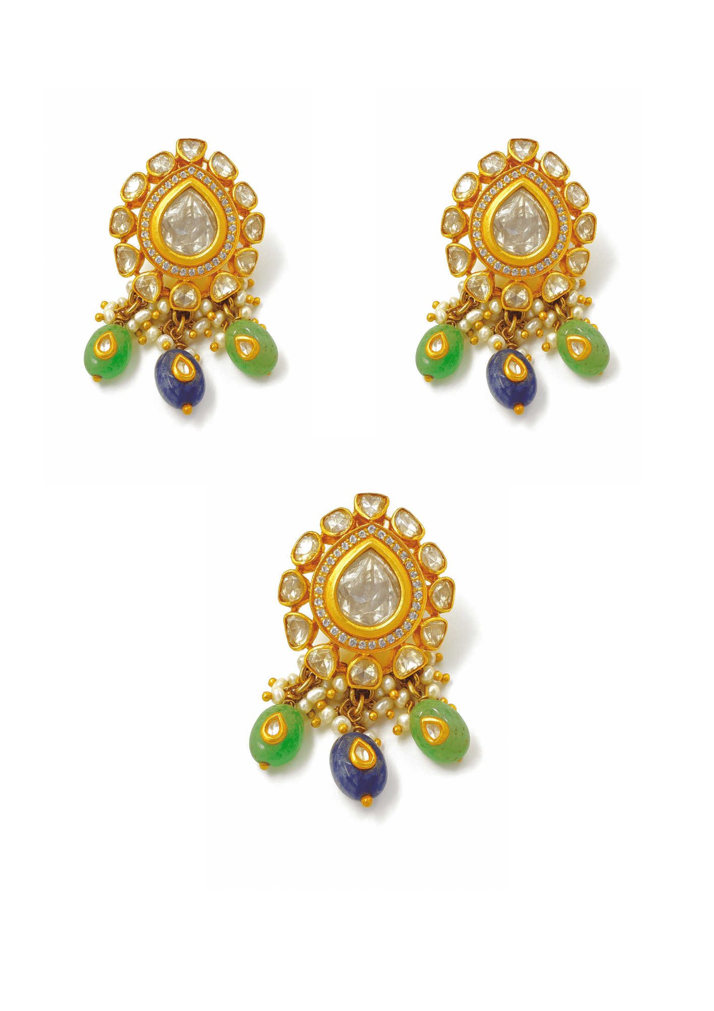 Upgrade your style with our Drop Saga Set. Crafted with precision, this pendant set features stunning Polki-like moissanites paired with exquisite emerald and sapphire semi-precious stones. Elevate your look with our expert karigari and add a touch of elegance to any outfit.