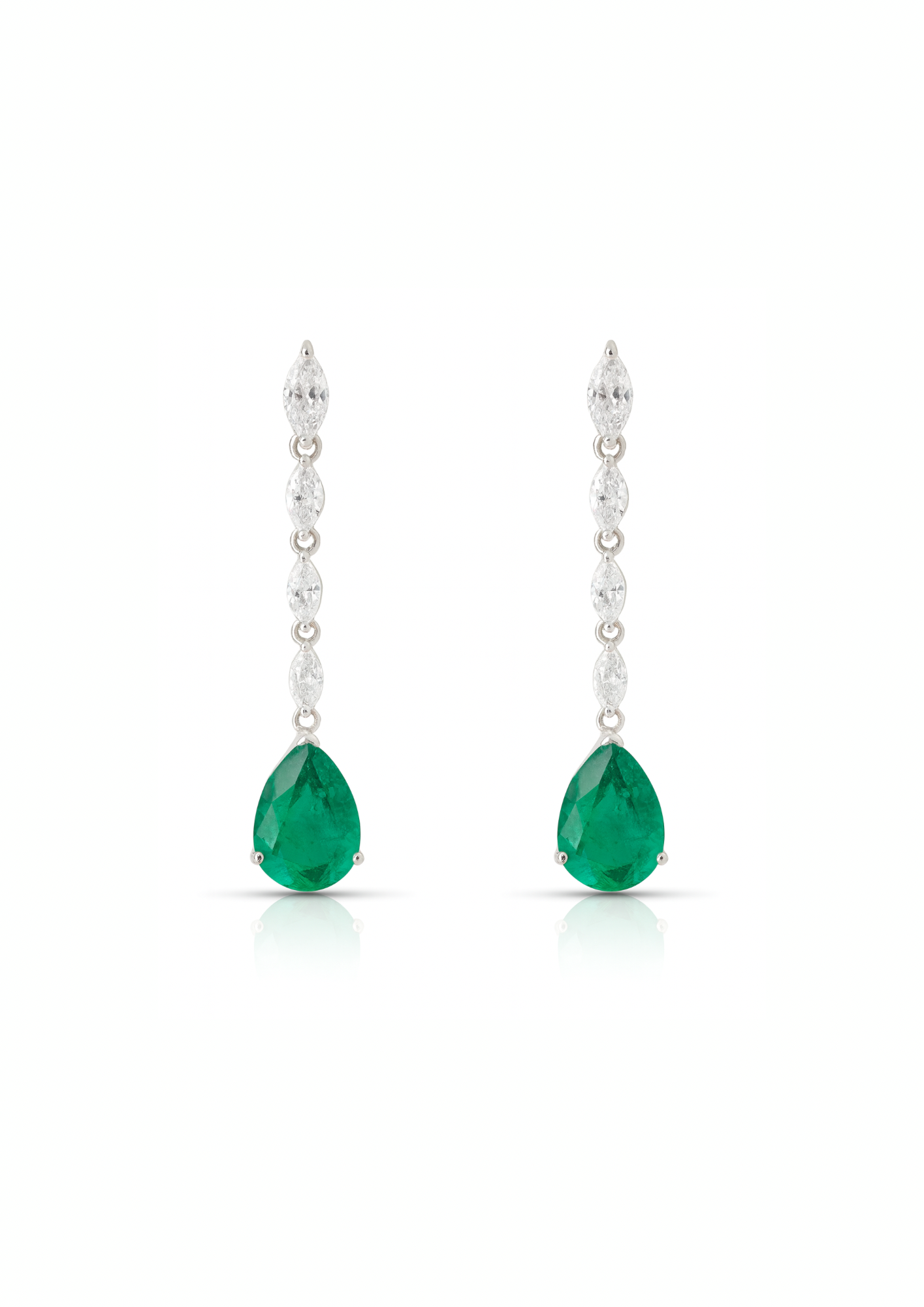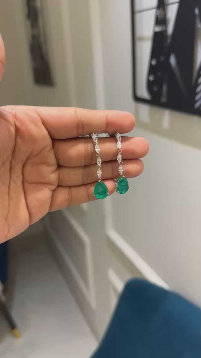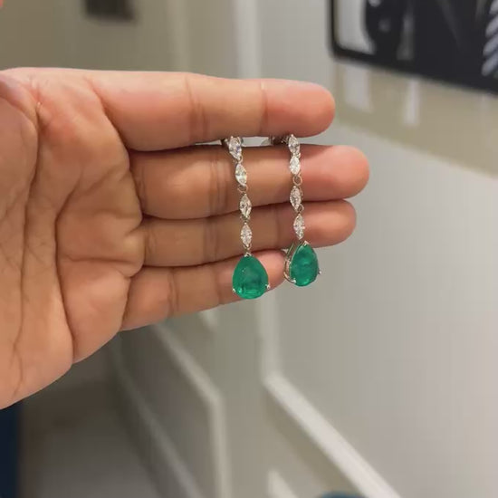 These elegant earrings feature emerald moissanite gems set in sleek, long danglers. With a modern and sophisticated design, these earrings are perfect for adding a touch of luxury to any outfit. The emerald moissanite adds a stunning pop of color, making these earrings a statement piece.