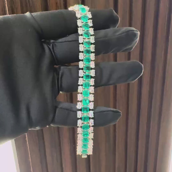 Expertly crafted from the highest quality emeralds and diamond-like stones, our Emerald Oval Solitaire Bracelet exudes elegance and sophistication. The stunning combination of gemstones and premium design make it the perfect accessory for special occasions or a glamorous night out. Elevate your style with this luxurious and timeless piece.