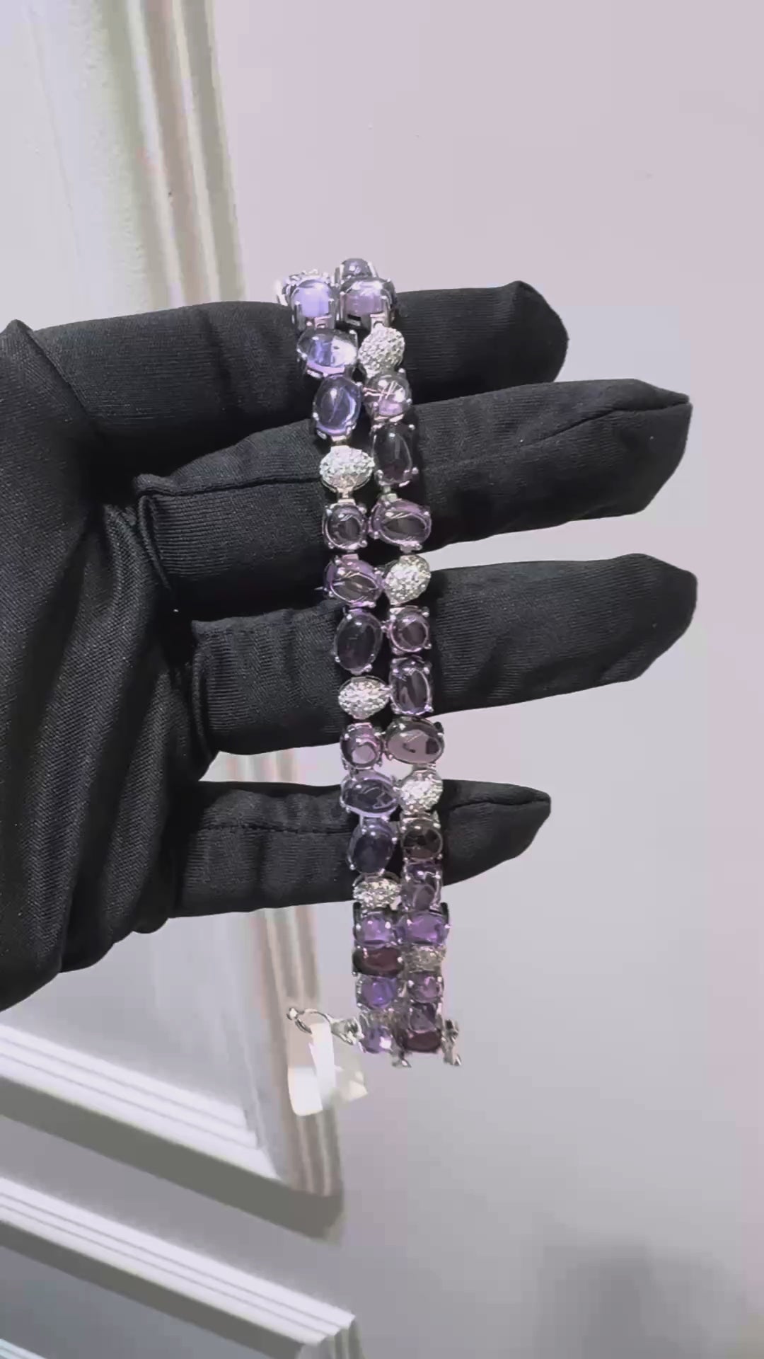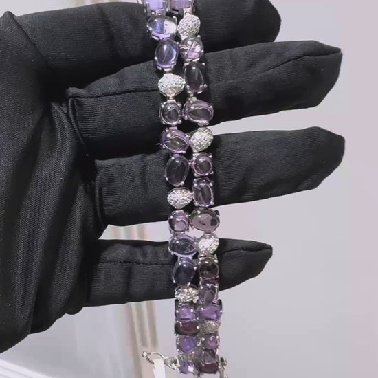 Elevate your jewelry game with our Rare Amethyst Silver Bracelet. Handcrafted with a stunning river-like formation of amethyst stones, this luxurious bracelet is perfect for cocktail events, parties, and wedding sagas. The rare cabochon stones add an elegant touch to any outfit. A true masterpiece for your collection.