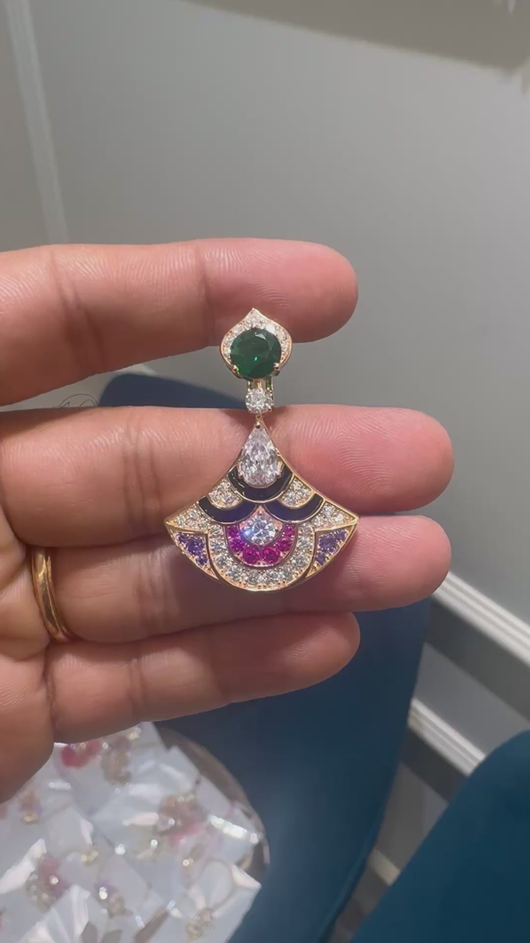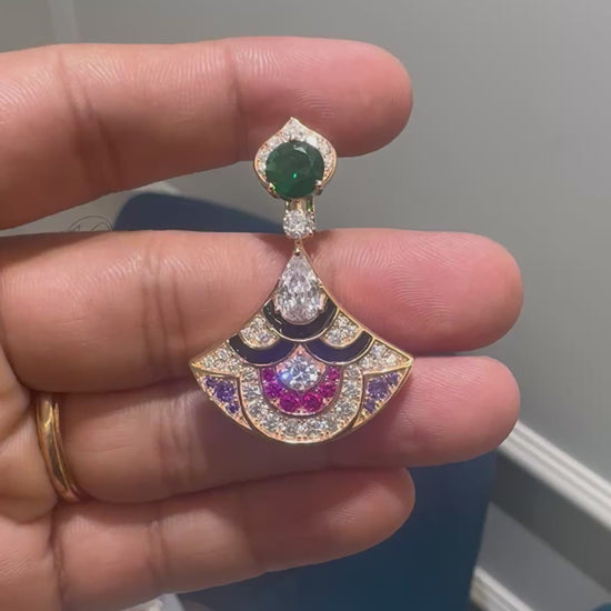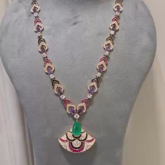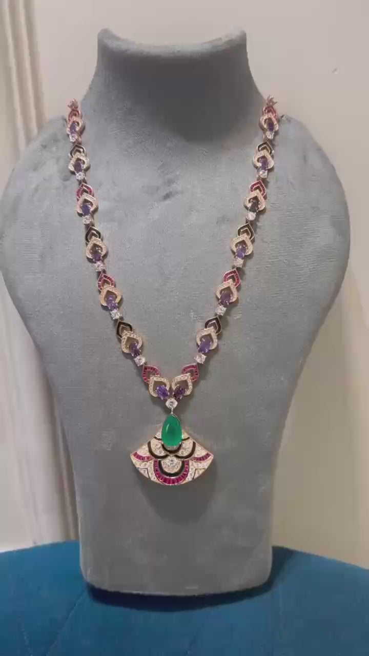 This premium Wonder Necklace showcases a stunning combination of rubies, tanzanites, black enamel, and green emeralds, all set in a moissanite form. Its rich and elegant design makes it perfect for parties, weddings, and gifting. Elevate any outfit with this classic and luxurious necklace.